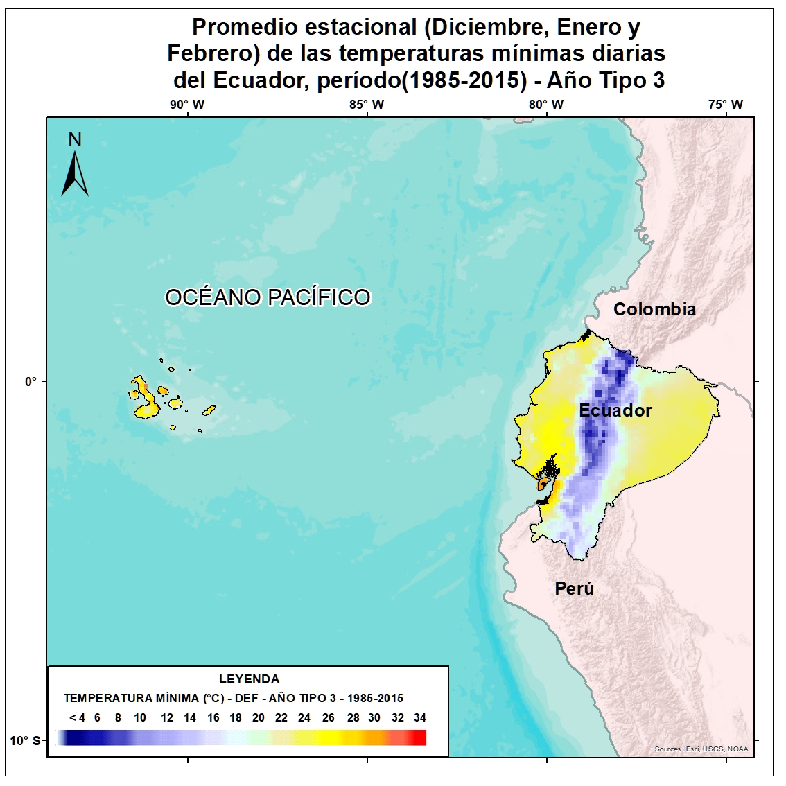 Para una adecuada planificación de la adaptación al cambio climático y el establecimiento de opciones de adaptación acorde a los contextos territoriales es de suma importancia el conocimiento, la comprensión y gestión de información climática pasada, presente y futura. Por tal motivo el Ecuador realizó un proceso de actualización de sus proyecciones climáticas de precipitación y temperatura actuales y futuras tomando como referencia los escenarios del AR6 y modelos de circulación global del Coupled Model Intercomparison Project 6 (CMIP6). Estas proyecciones en Ecuador fueron calculadas a partir de los promedios estacionales para todas las tipologías de años tipos diarios y se encuentran a una escala de 10 km X 10 km. Bajo este enfoque se desarrolló el mapa del promedio estacional (Diciembre, Enero y Febrero) de las temperaturas mínimas diarias del Ecuador, período (1985-2015) - Año Tipo 4. Esta información servirá como insumo para la gestión de la adaptación al cambio climático en el país.