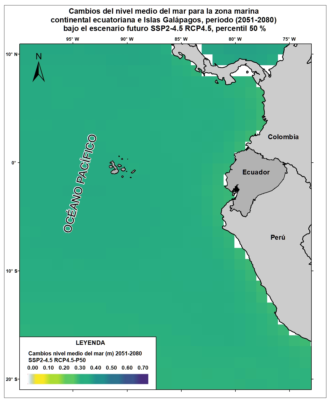 Las variables oceánicas como la temperatura superficial del mar, la acidificación oceánica, el aumento del nivel del mar, entre otras, resultan vitales para proyectar y monitorear los efectos del cambio climático sobre el comportamiento oceánico y atmosférico a escala local, regional y global. Para el país, la generación de información clave sobre esta temática permitiría evaluar la situación actual y posibles consecuencias futuras de las alteraciones climáticas sobre las zonas costeras y sus habitantes. Por esta razón, el Ecuador ha considerado estratégico incluir en la Cuarta Comunicación Nacional la generación de información sobre cambios en variables de mares y océanos ecuatorianos respecto al cambio climático. Bajo este enfoque se desarrolló el Ensamble de 21 Modelos Climáticos Globales del CMIP5 para la variable de Nivel Medio del Mar referidos para las costas del Ecuador y Galápagos. Esta capa corresponde a los cambios del Nivel Medio del Mar (percentil 50%) para el horizonte lejano (2051-2080) del nivel 0 de referencia (media del período 1986-2005) en el escenario SSP2-4.5/RCP4.5. Para una adecuada visualización y representación de los datos en relación al área de estudio (10°N y 20°S), se recomienda fijar los valores mínimos y máximos de acuerdo a lo siguiente: Valor máximo: 0.7, Valor mínimo: 0