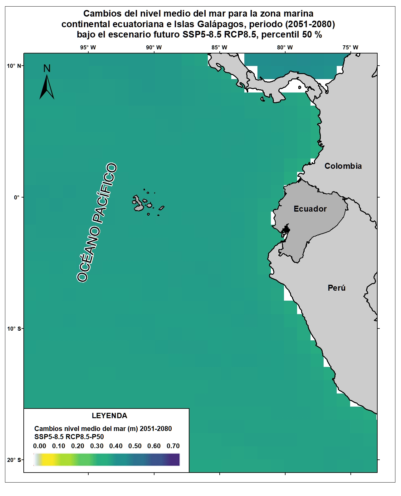 Las variables oceánicas como la temperatura superficial del mar, la acidificación oceánica, el aumento del nivel del mar, entre otras, resultan vitales para proyectar y monitorear los efectos del cambio climático sobre el comportamiento oceánico y atmosférico a escala local, regional y global. Para el país, la generación de información clave sobre esta temática permitiría evaluar la situación actual y posibles consecuencias futuras de las alteraciones climáticas sobre las zonas costeras y sus habitantes. Por esta razón, el Ecuador ha considerado estratégico incluir en la Cuarta Comunicación Nacional la generación de información sobre cambios en variables de mares y océanos ecuatorianos respecto al cambio climático. Bajo este enfoque se desarrolló el Ensamble de 21 Modelos Climáticos Globales del CMIP5 para la variable de Nivel Medio del Mar referidos para las costas del Ecuador y Galápagos. Esta capa corresponde a los cambios del Nivel Medio del Mar (percentil 50%) para el horizonte lejano (2051-2080) del nivel 0 de referencia (media del período 1986-2005) en el escenario SSP5-8.5 RCP8.5. Para una adecuada visualización y representación de los datos en relación al área de estudio (10°N y 20°S), se recomienda fijar los valores mínimos y máximos de acuerdo a lo siguiente: Valor máximo: 0.7, Valor mínimo: 0