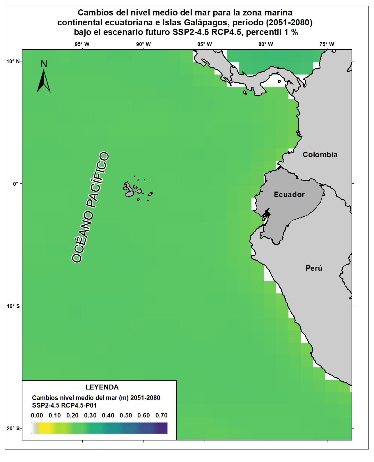 Las variables oceánicas como la temperatura superficial del mar, la acidificación oceánica, el aumento del nivel del mar, entre otras, resultan vitales para proyectar y monitorear los efectos del cambio climático sobre el comportamiento oceánico y atmosférico a escala local, regional y global. Para el país, la generación de información clave sobre esta temática permitiría evaluar la situación actual y posibles consecuencias futuras de las alteraciones climáticas sobre las zonas costeras y sus habitantes. Por esta razón, el Ecuador ha considerado estratégico incluir en la Cuarta Comunicación Nacional la generación de información sobre cambios en variables de mares y océanos ecuatorianos respecto al cambio climático. Bajo este enfoque se desarrolló el Ensamble de 21 Modelos Climáticos Globales del CMIP5 para la variable de Nivel Medio del Mar referidos para las costas del Ecuador y Galápagos. Esta capa corresponde a los cambios del Nivel Medio del Mar (percentil 1%) para el horizonte lejano (2051-2080) del nivel 0 de referencia (media del período 1986-2005) en el escenario SSP2-4.5/RCP4.5. Para una adecuada visualización y representación de los datos en relación al área de estudio (10°N y 20°S), se recomienda fijar los valores mínimos y máximos de acuerdo a lo siguiente: Valor máximo: 0.7, Valor mínimo: 0