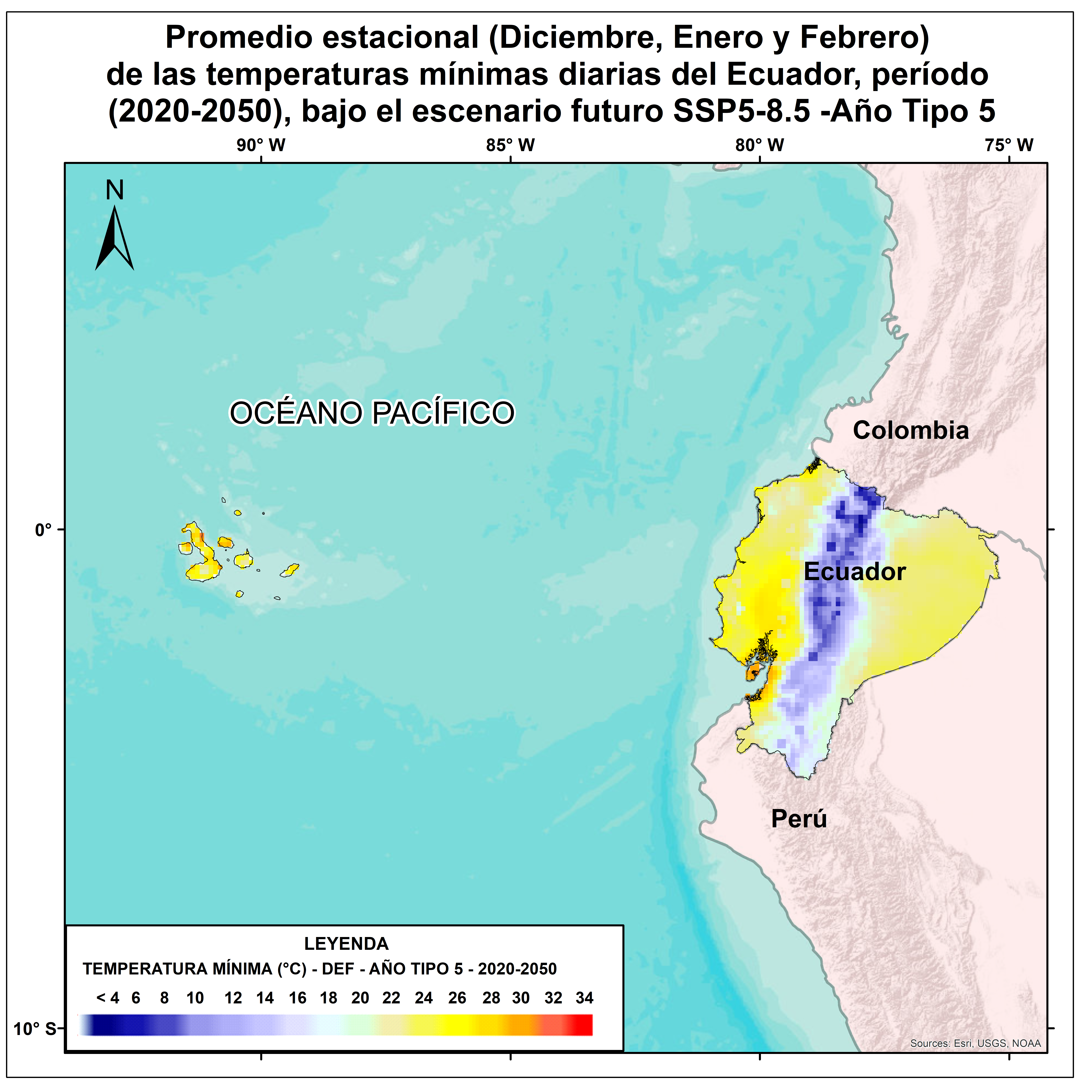 Para una adecuada planificación de la adaptación al cambio climático y el establecimiento de opciones de adaptación acorde a los contextos territoriales es de suma importancia el conocimiento, la comprensión y gestión de información climática pasada, presente y futura. Por tal motivo el Ecuador realizó un proceso de actualización de sus proyecciones climáticas de precipitación y temperatura actuales y futuras tomando como referencia los escenarios del AR6 y modelos de circulación global del Coupled Model Intercomparison Project 6 (CMIP6). Estas proyecciones en Ecuador fueron calculadas a partir de los promedios estacionales para todas las tipologías de años tipos diarios y se encuentran a una escala de 10 km X 10 km. Bajo este enfoque se desarrolló el mapa del promedio estacional (Diciembre, Enero y Febrero) de temperatura mínima diaria en el Ecuador, período (2020 - 2050), a partir de los promedios del Año Tipo 5. Esta información servirá como insumo para la gestión de la adaptación al cambio climático en el país.