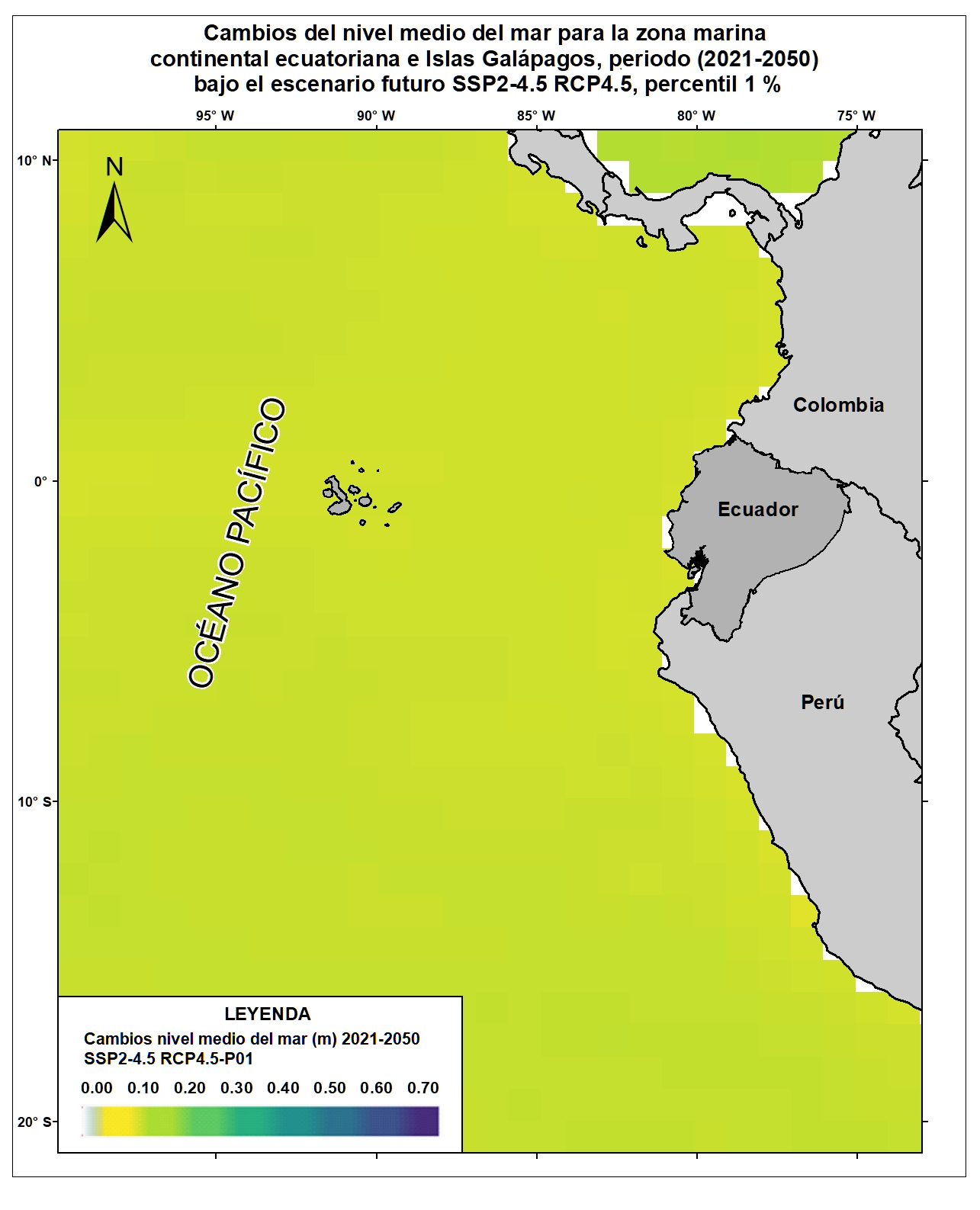 Las variables oceánicas como la temperatura superficial del mar, la acidificación oceánica, el aumento del nivel del mar, entre otras, resultan vitales para proyectar y monitorear los efectos del cambio climático sobre el comportamiento oceánico y atmosférico a escala local, regional y global. Para el país, la generación de información clave sobre esta temática permitiría evaluar la situación actual y posibles consecuencias futuras de las alteraciones climáticas sobre las zonas costeras y sus habitantes. Por esta razón, el Ecuador ha considerado estratégico incluir en la Cuarta Comunicación Nacional la generación de información sobre cambios en variables de mares y océanos ecuatorianos respecto al cambio climático. Bajo este enfoque se desarrolló el Ensamble de 21 Modelos Climáticos Globales del CMIP5 para la variable de Nivel Medio del Mar referidos para las costas del Ecuador y Galápagos. Esta capa corresponde a los cambios del Nivel Medio del Mar (percentil 1%) para el horizonte cercano (2021-2050) del nivel 0 de referencia (media del período 1986-2005) en el escenario SSP2-4.5/RCP4.5. Para una adecuada visualización y representación de los datos en relación al área de estudio (10°N y 20°S), se recomienda fijar los valores mínimos y máximos de acuerdo a lo siguiente: Valor máximo: 0.7, Valor mínimo: 0