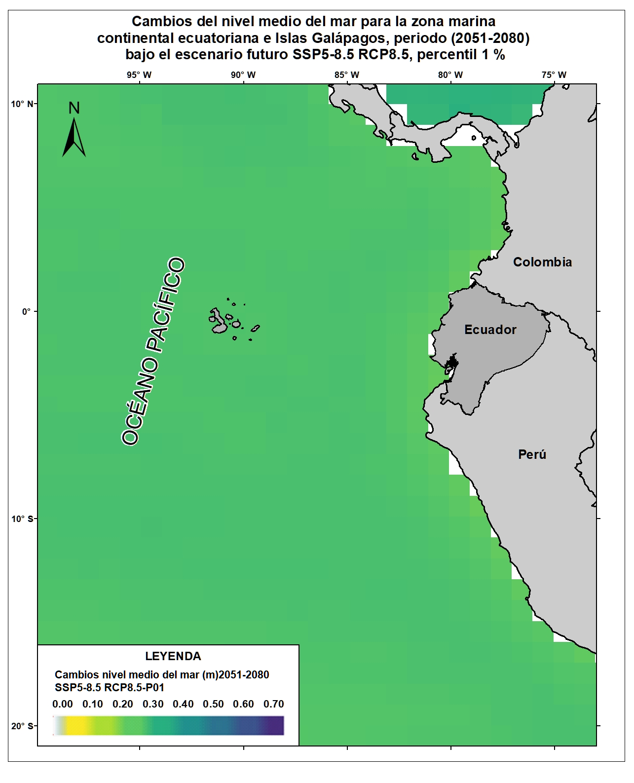 Las variables oceánicas como la temperatura superficial del mar, la acidificación oceánica, el aumento del nivel del mar, entre otras, resultan vitales para proyectar y monitorear los efectos del cambio climático sobre el comportamiento oceánico y atmosférico a escala local, regional y global. Para el país, la generación de información clave sobre esta temática permitiría evaluar la situación actual y posibles consecuencias futuras de las alteraciones climáticas sobre las zonas costeras y sus habitantes. Por esta razón, el Ecuador ha considerado estratégico incluir en la Cuarta Comunicación Nacional la generación de información sobre cambios en variables de mares y océanos ecuatorianos respecto al cambio climático. Bajo este enfoque se desarrolló el Ensamble de 21 Modelos Climáticos Globales del CMIP5 para la variable de Nivel Medio del Mar referidos para las costas del Ecuador y Galápagos. Esta capa corresponde a los cambios del Nivel Medio del Mar (percentil 1%) para el horizonte lejano (2051-2080) del nivel 0 de referencia (media del período 1986-2005) en el escenario SSP5-8.5 RCP8.5. Para una adecuada visualización y representación de los datos en relación al área de estudio (10°N y 20°S), se recomienda fijar los valores mínimos y máximos de acuerdo a lo siguiente: Valor máximo: 0.7, Valor mínimo: 0