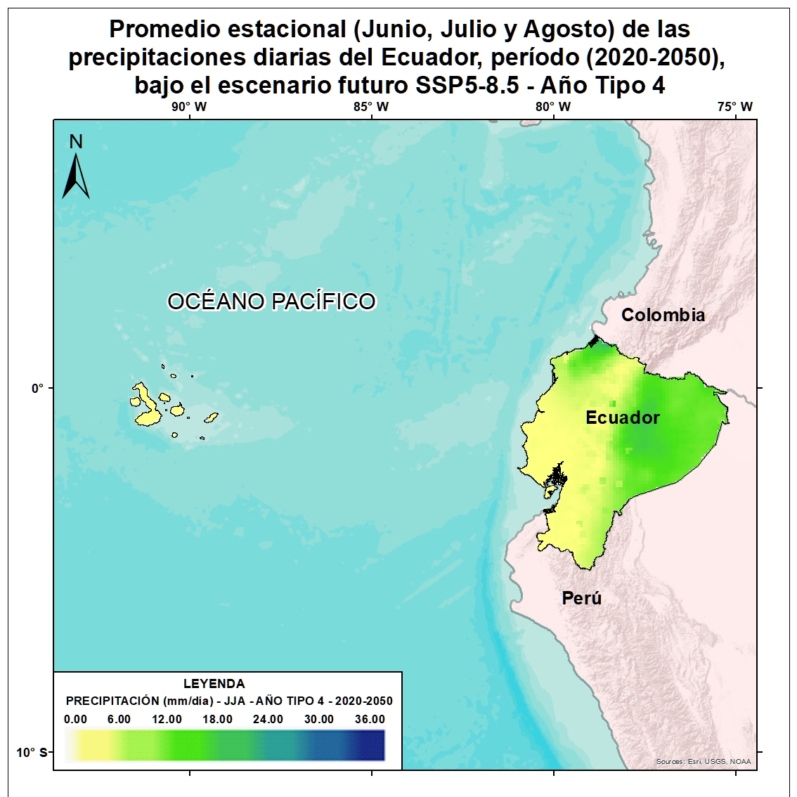 Para una adecuada planificación de la adaptación al cambio climático y el establecimiento de opciones de adaptación acorde a los contextos territoriales, es de suma importancia el conocimiento, la comprensión y gestión de información climática pasada, presente y futura. Por tal motivo el Ecuador realizó un proceso de actualización de sus proyecciones climáticas de precipitación y temperatura actuales y futuras, tomando como referencia los escenarios del AR6 y modelos de circulación global del Coupled Model Intercomparison Project 6 (CMIP6). Estas proyecciones en Ecuador fueron calculadas a partir de los promedios estacionales para todas las tipologías de años tipos diarios y se encuentran a una escala de 10 km X 10 km. Bajo este enfoque se desarrolló el mapa del promedio estacional (Junio, Julio y Agosto) de precipitación diaria en el Ecuador, período (2020 - 2050), a partir de los promedios del Año Tipo 4. Esta información servirá como insumo para la gestión de la adaptación al cambio climático en el país.