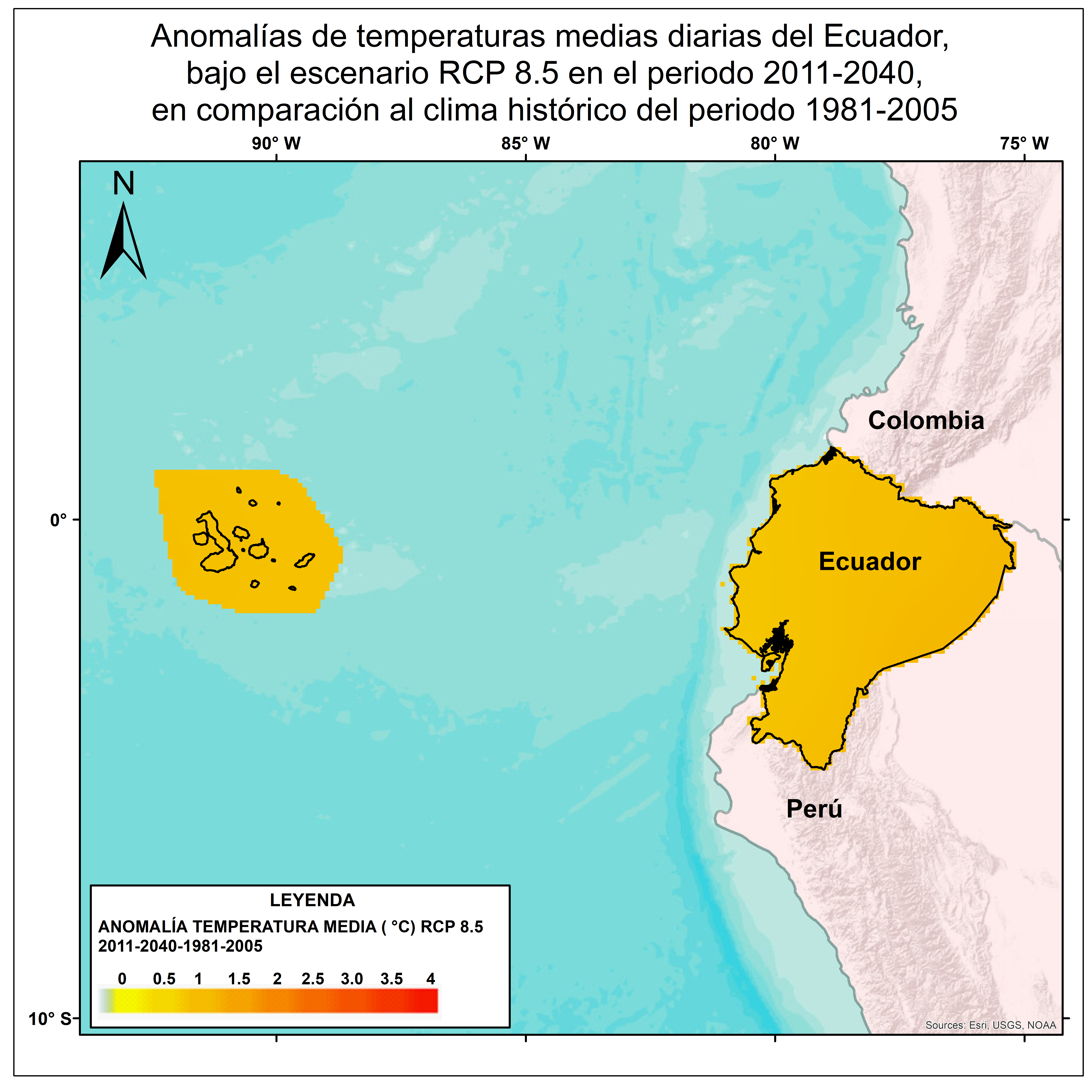 Como parte de los compromisos que tiene el Ecuador ante la Convención Marco de las Naciones Unidas sobre Cambio Climático (CMUNCC) en el 2017 se presentó la Tercera Comunicación Nacional sobre cambio climático del Ecuador. Para los fines antes descritos, se desarrollaron Proyecciones Climáticas de precipitación y temperatura actuales y futuras tomando como referencia los escenarios de emisiones RCP y modelos de circulación global del Coupled Model Intercomparison Project 5 (CMIP5). Estas proyecciones climáticas para el Ecuador se encuentran a una escala 10 km X 10 km gracias a la aplicación de un downscaling dinámico. Bajo este enfoque se desarrolló el mapa de anomalías de temperaturas medias diarias del Ecuador, bajo el escenario RCP 8.5 en el periodo 2011-2040, en comparación al clima histórico del periodo 1981-2005, esta información es un insumo importante para facilitar la gestión de la adaptación al cambio climático en el país.