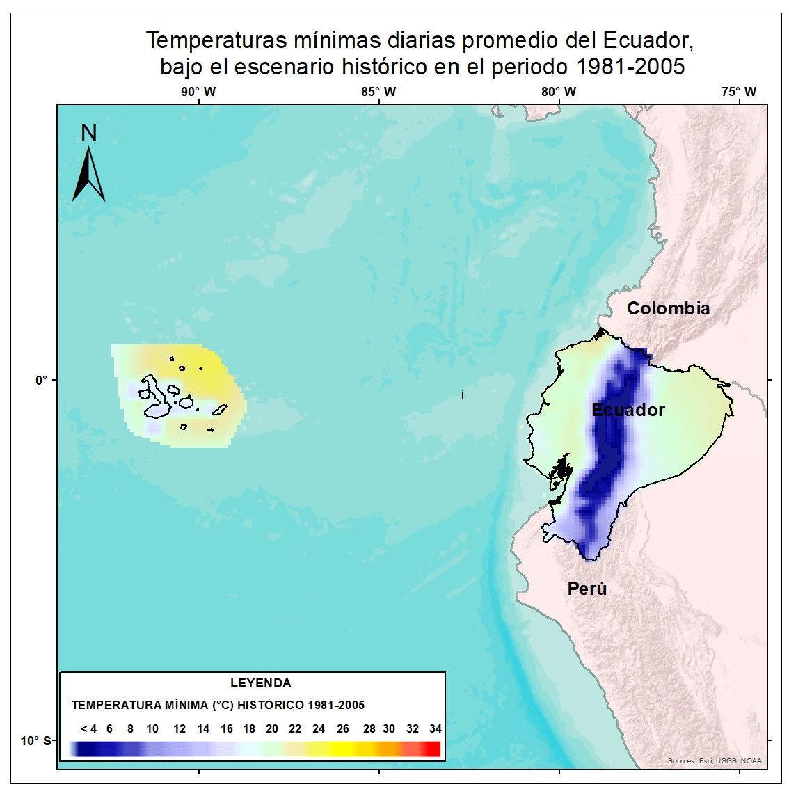 Como parte de los compromisos que tiene el Ecuador ante la Convención Marco de las Naciones Unidas sobre Cambio Climático (CMUNCC) en el 2017 se presentó la Tercera Comunicación Nacional sobre cambio climático del Ecuador. Para los fines antes descritos, se desarrollaron Proyecciones Climáticas de precipitación y temperatura actuales y futuras tomando como referencia los escenarios de emisiones RCP y modelos de circulación global del Coupled Model Intercomparison Project 5 (CMIP5). Estas proyecciones climáticas para el Ecuador se encuentran a una escala 10 km X 10 km gracias a la aplicación de un downscaling dinámico. Bajo este enfoque se desarrolló el mapa de temperaturas mínimas diarias promedio en el Ecuador bajo el escenario histórico en el periodo (1981-2005), esta información es un insumo importante para facilitar la gestión de la adaptación al cambio climático en el país.
