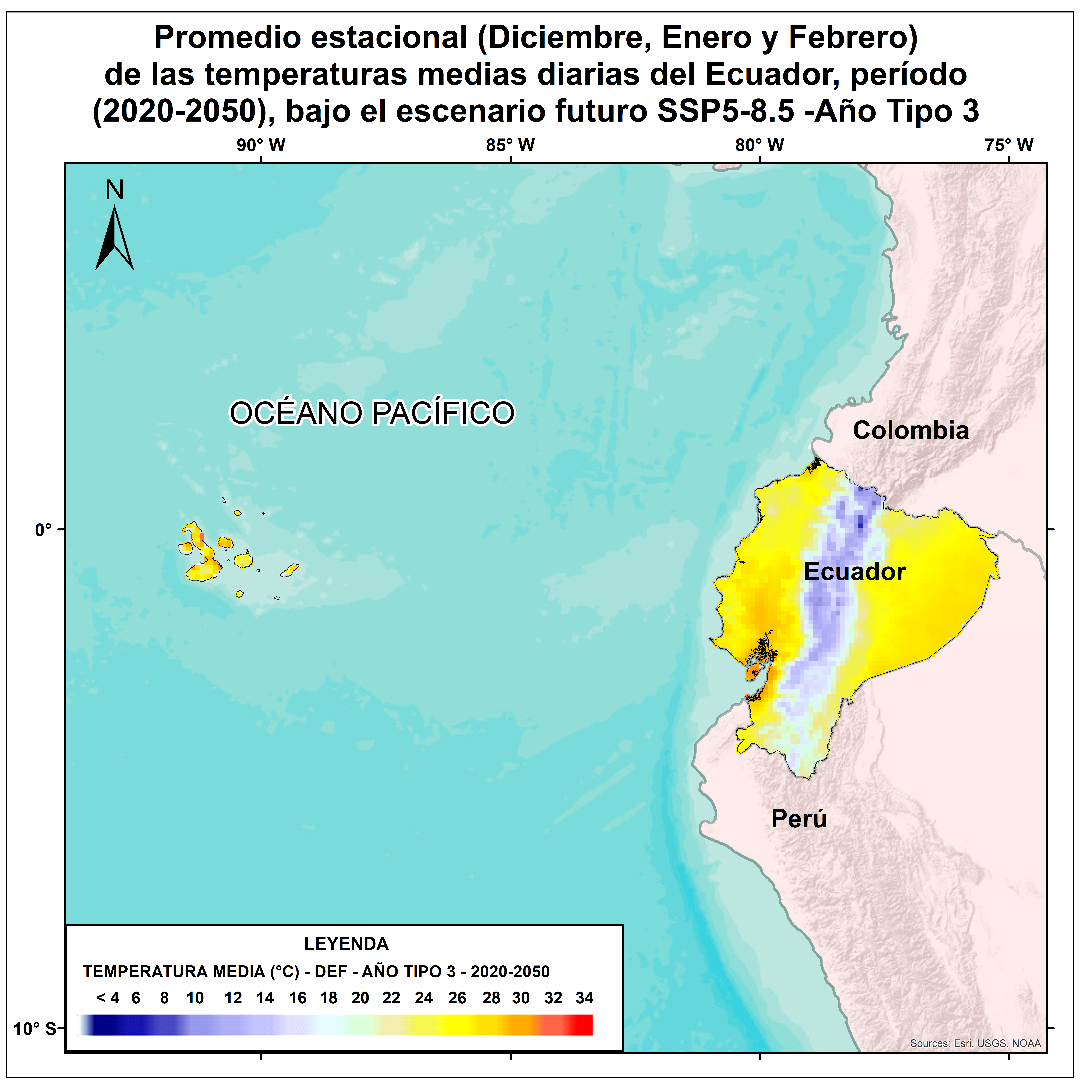Para una adecuada planificación de la adaptación al cambio climático y el establecimiento de opciones de adaptación acorde a los contextos territoriales es de suma importancia el conocimiento, la comprensión y gestión de información climática pasada, presente y futura. Por tal motivo el Ecuador realizó un proceso de actualización de sus proyecciones climáticas de precipitación y temperatura actuales y futuras tomando como referencia los escenarios del AR6 y modelos de circulación global del Coupled Model Intercomparison Project 6 (CMIP6). Estas proyecciones en Ecuador fueron calculadas a partir de los promedios estacionales para todas las tipologías de años tipos diarios y se encuentran a una escala de 10 km X 10 km. Bajo este enfoque se desarrolló el mapa del promedio estacional (Diciembre, Enero y Febrero) de temperatura media diaria en el Ecuador, período (2020 - 2050), a partir de los promedios del Año Tipo 3. Esta información servirá como insumo para la gestión de la adaptación al cambio climático en el país.