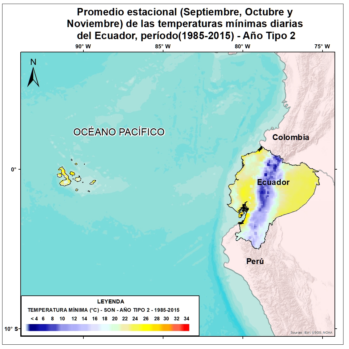 Para una adecuada planificación de la adaptación al cambio climático y el establecimiento de opciones de adaptación acorde a los contextos territoriales es de suma importancia el conocimiento, la comprensión y gestión de información climática pasada, presente y futura. Por tal motivo el Ecuador realizó un proceso de actualización de sus proyecciones climáticas de precipitación y temperatura actuales y futuras tomando como referencia los escenarios del AR6 y modelos de circulación global del Coupled Model Intercomparison Project 6 (CMIP6). Estas proyecciones en Ecuador fueron calculadas a partir de los promedios estacionales para todas las tipologías de años tipos diarios y se encuentran a una escala de 10 km X 10 km. Bajo este enfoque se desarrolló el mapa del promedio estacional (Septiembre, Octubre y Noviembre) de las temperaturas mínimas diarias del Ecuador, período (1985-2015) - Año Tipo 2. Esta información servirá como insumo para la gestión de la adaptación al cambio climático en el país.