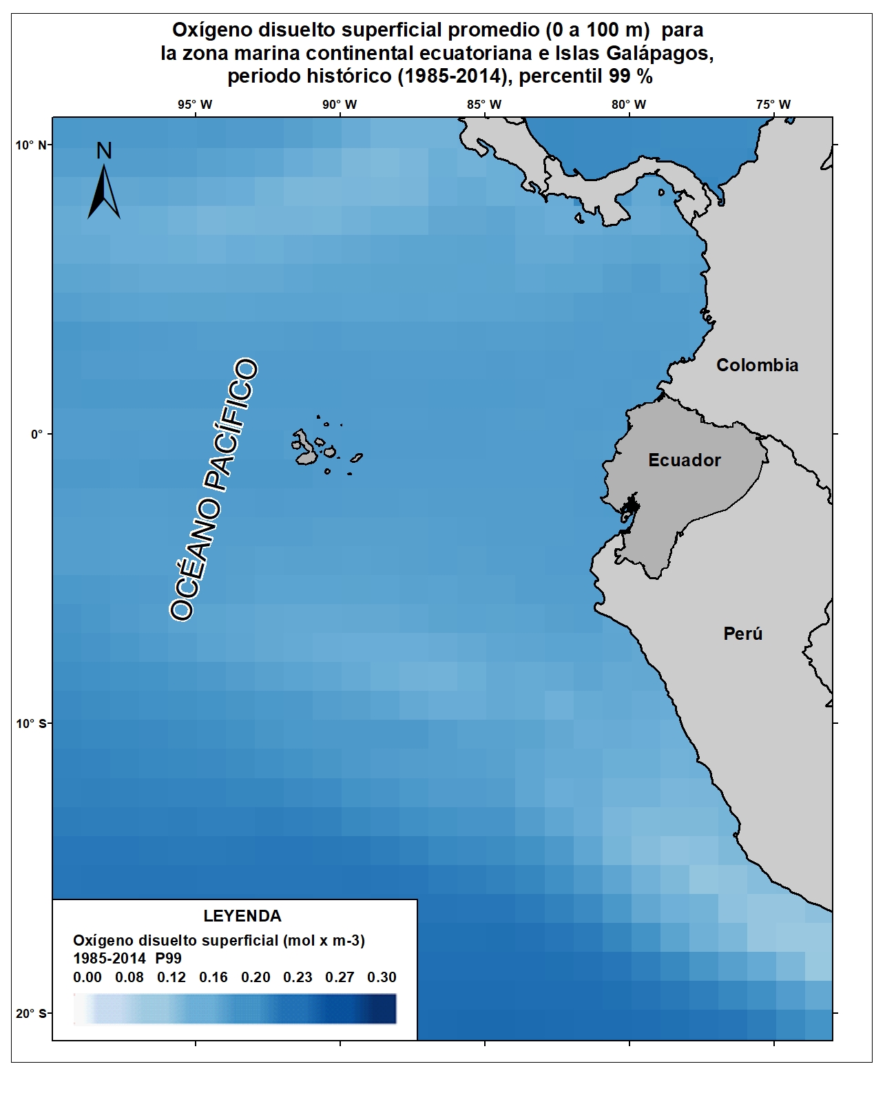 Las variables oceánicas como la temperatura superficial del mar, la acidificación oceánica, el aumento del nivel del mar, entre otras, resultan vitales para proyectar y monitorear los efectos del cambio climático sobre el comportamiento oceánico y atmosférico a escala local, regional y global. Para el país, la generación de información clave sobre esta temática permitiría evaluar la situación actual y posibles consecuencias futuras de las alteraciones climáticas sobre las zonas costeras y sus habitantes. Por esta razón, el Ecuador ha considerado estratégico incluir en la Cuarta Comunicación Nacional la generación de información sobre cambios en variables de mares y océanos ecuatorianos respecto al cambio climático. Bajo este enfoque se desarrolló el ensamble de 12 Modelos Climáticos Globales del CMIP6 para la variable Oxígeno Disuelto Superficial (0 a 100m) referidos para las costas del Ecuador y Galápagos. Esta capa corresponde al campo de concentración de oxígeno disuelto promedio entre 0m y 100 m de profundidad ( percentil 99%) para el período histórico (1985-2014). Para una adecuada visualización y representación de los datos en relación al área de estudio (10°N y 20°S), se recomienda fijar los valores mínimos y máximos de acuerdo a lo siguiente: Valor máximo: 0.3, Valor mínimo: 0
