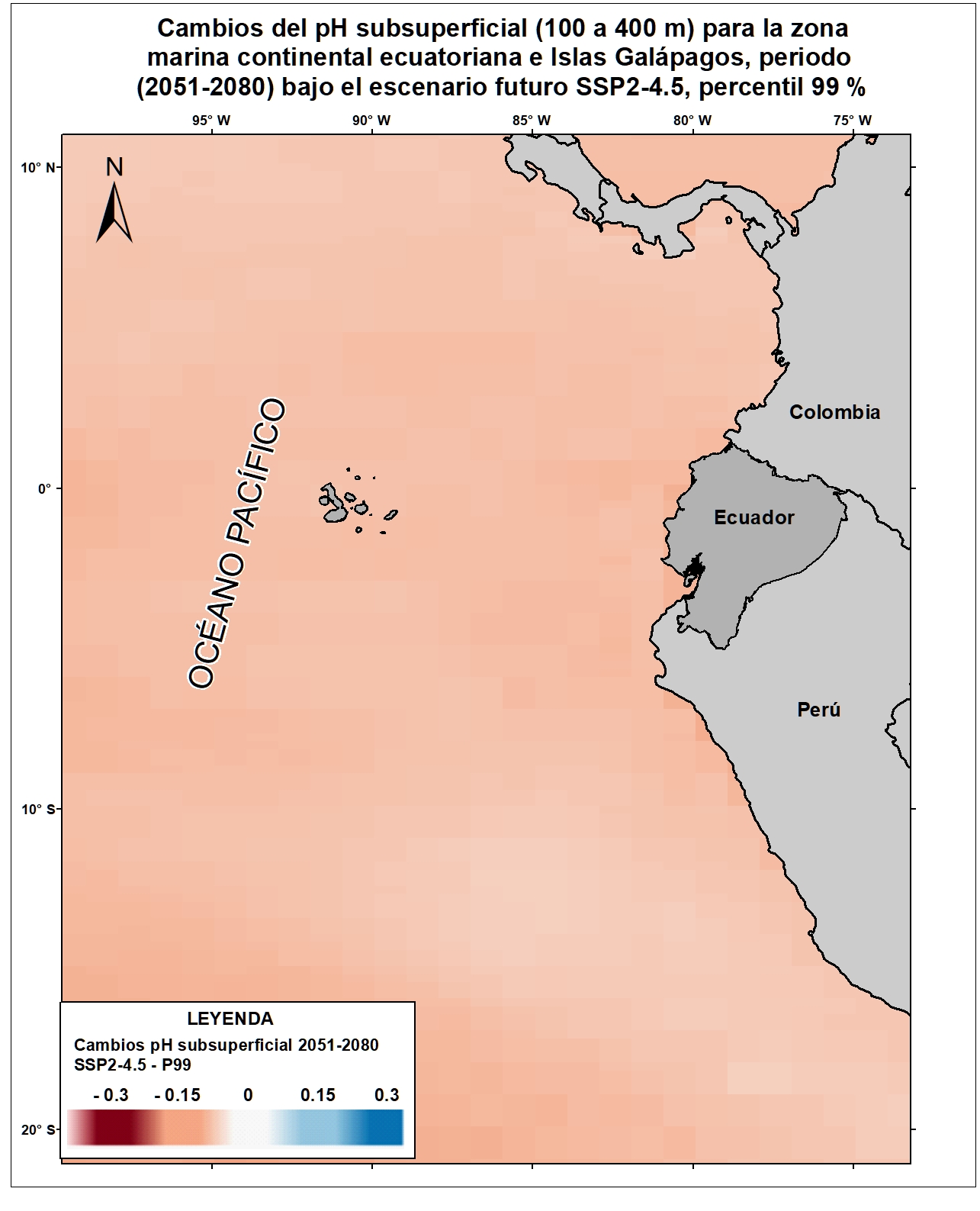 Las variables oceánicas como la temperatura superficial del mar, la acidificación oceánica, el aumento del nivel del mar, entre otras, resultan vitales para proyectar y monitorear los efectos del cambio climático sobre el comportamiento oceánico y atmosférico a escala local, regional y global. Para el país, la generación de información clave sobre esta temática permitiría evaluar la situación actual y posibles consecuencias futuras de las alteraciones climáticas sobre las zonas costeras y sus habitantes. Por esta razón, el Ecuador ha considerado estratégico incluir en la Cuarta Comunicación Nacional la generación de información sobre cambios en variables de mares y océanos ecuatorianos respecto al cambio climático. Bajo este enfoque se desarrolló el ensamble de 9 Modelos Climáticos Globales del CMIP6 para la variable pH subsuperficial (100 a 400 m) referidos para las costas del Ecuador y Galápagos. Esta capa corresponde a los cambios esperados para el pH subsuperficial (100 a 400 m) para el horizonte cercano (2021-2050) en el escenario SSP2-4.5 (percentil 99 %). Para una adecuada visualización y representación de los datos en relación al área de estudio (10°N y 20°S), se recomienda fijar los valores mínimos y máximos de acuerdo a lo siguiente: Valor máximo: 0.3, Valor mínimo: -0.3