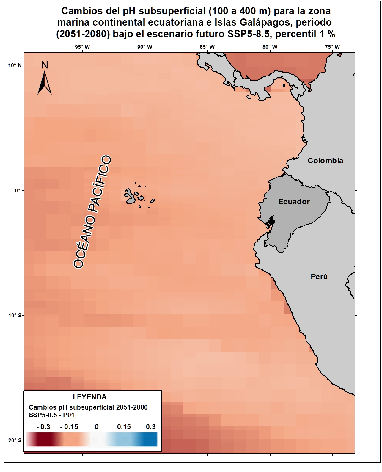 Las variables oceánicas como la temperatura superficial del mar, la acidificación oceánica, el aumento del nivel del mar, entre otras, resultan vitales para proyectar y monitorear los efectos del cambio climático sobre el comportamiento oceánico y atmosférico a escala local, regional y global. Para el país, la generación de información clave sobre esta temática permitiría evaluar la situación actual y posibles consecuencias futuras de las alteraciones climáticas sobre las zonas costeras y sus habitantes. Por esta razón, el Ecuador ha considerado estratégico incluir en la Cuarta Comunicación Nacional la generación de información sobre cambios en variables de mares y océanos ecuatorianos respecto al cambio climático. Bajo este enfoque se desarrolló el ensamble de 9 Modelos Climáticos Globales del CMIP6 para la variable pH subsuperficial (100 a 400 m) referidos para las costas del Ecuador y Galápagos. Esta capa corresponde a los cambios esperados para el pH subsuperficial (100 a 400 m) para el horizonte lejano (2051-2080) en el escenario SSP5-8.5 (percentil 1%). Para una adecuada visualización y representación de los datos en relación al área de estudio (10°N y 20°S), se recomienda fijar los valores mínimos y máximos de acuerdo a lo siguiente: Valor máximo: 0.3, Valor mínimo: -0.3