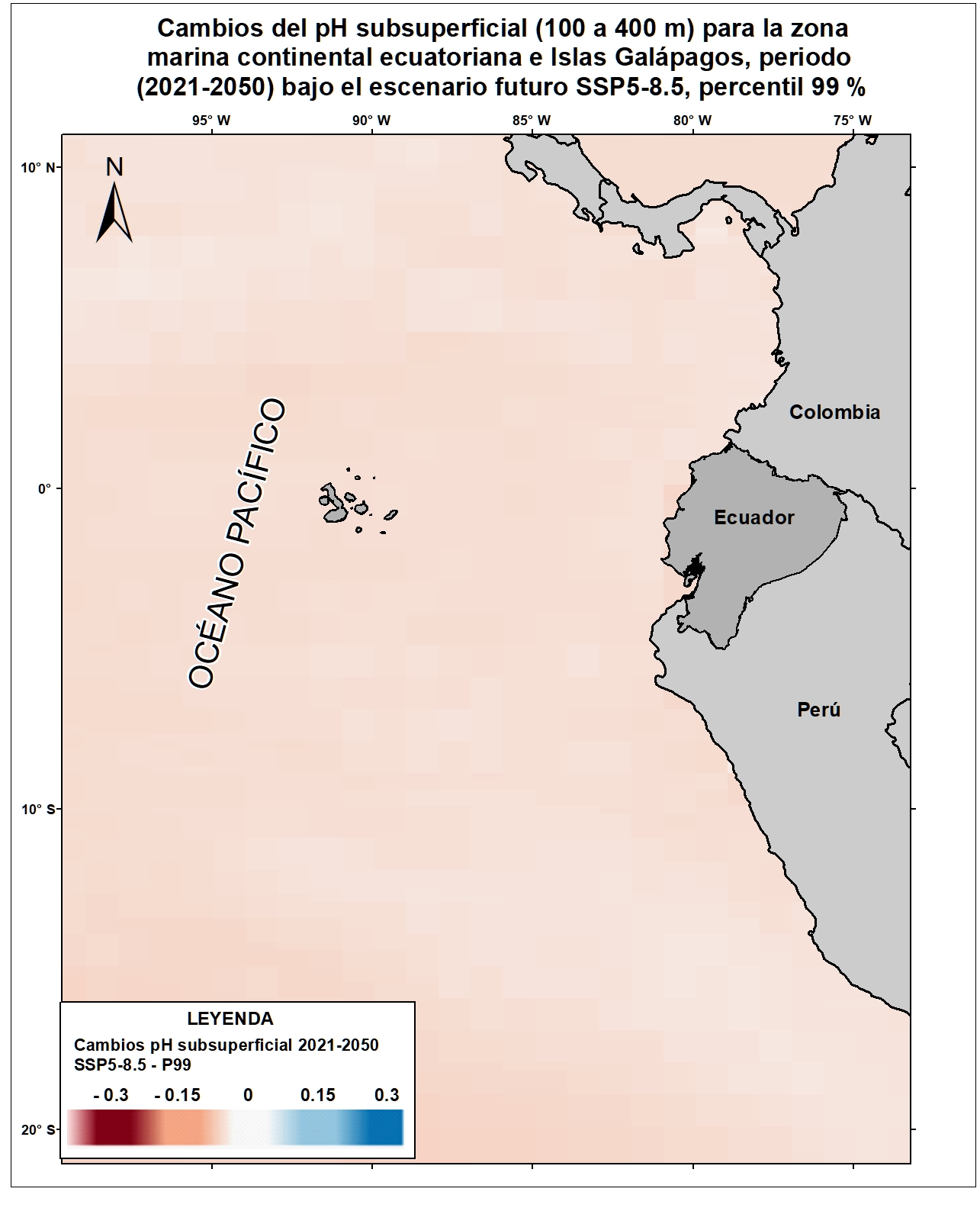 Las variables oceánicas como la temperatura superficial del mar, la acidificación oceánica, el aumento del nivel del mar, ente otras, resultan vitales para proyectar y monitorear los efectos del cambio climático sobre el comportamiento oceánico y atmosférico a escala local, regional y global. Para el país, la generación de información clave sobre esta temática permitiría evaluar la situación actual y posibles consecuencias futuras de las alteraciones climáticas sobre las zonas costeras y sus habitantes. Por esta razón, el Ecuador ha considerado estratégico incluir en la Cuarta Comunicación Nacional la generación de información sobre cambios en variables de mares y océanos ecuatorianos respecto al cambio climático. Bajo este enfoque se desarrolló el ensamble de 9 Modelos Climáticos Globales del CMIP6 para la variable pH subsuperficial (100 a 400 m) referidos para las costas del Ecuador y Galápagos. Esta capa corresponde a los cambios esperados para el pH subsuperficial (100 a 400 m) para el horizonte cercano (2021-2050) en el escenario SSP5-8.5 (percentil 99 %). Para una adecuada visualización y representación de los datos en relación al área de estudio (10°N y 20°S), se recomienda fijar los valores mínimos y máximos de acuerdo a lo siguiente: Valor máximo: 0.3, Valor mínimo: -0.3