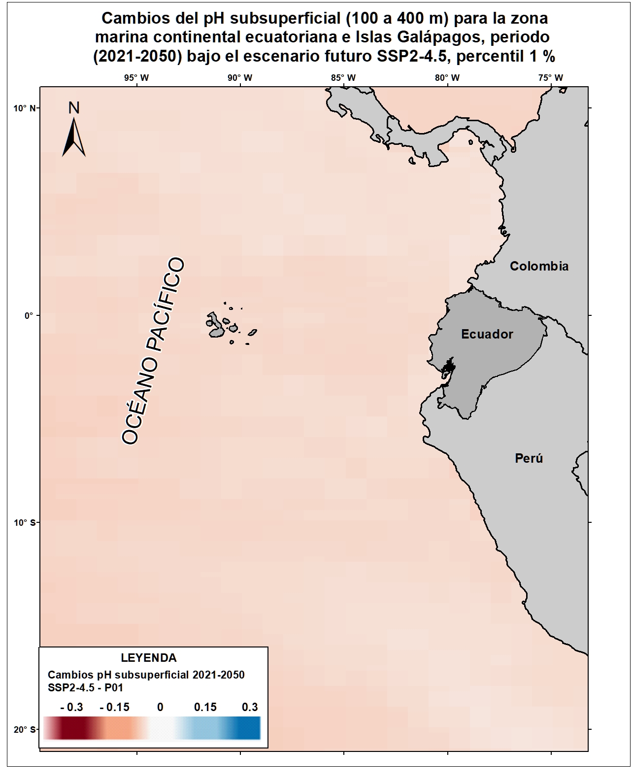 Las variables oceánicas como la temperatura superficial del mar, la acidificación oceánica, el aumento del nivel del mar, entre otras, resultan vitales para proyectar y monitorear los efectos del cambio climático sobre el comportamiento oceánico y atmosférico a escala local, regional y global. Para el país, la generación de información clave sobre esta temática permitiría evaluar la situación actual y posibles consecuencias futuras de las alteraciones climáticas sobre las zonas costeras y sus habitantes. Por esta razón, el Ecuador ha considerado estratégico incluir en la Cuarta Comunicación Nacional la generación de información sobre cambios en variables de mares y océanos ecuatorianos respecto al cambio climático. Bajo este enfoque se desarrolló el ensamble de 9 Modelos Climáticos Globales del CMIP6 para la variable pH subsuperficial (100 a 400 m) referidos para las costas del Ecuador y Galápagos. Esta capa corresponde a los cambios esperados para el pH subsuperficial (100 a 400 m) para el horizonte cercano (2021-2050) en el escenario SSP2-4.5 (percentil 1%). Para una adecuada visualización y representación de los datos en relación al área de estudio (10°N y 20°S), se recomienda fijar los valores mínimos y máximos de acuerdo a lo siguiente: Valor máximo: 0.3, Valor mínimo: -0.3