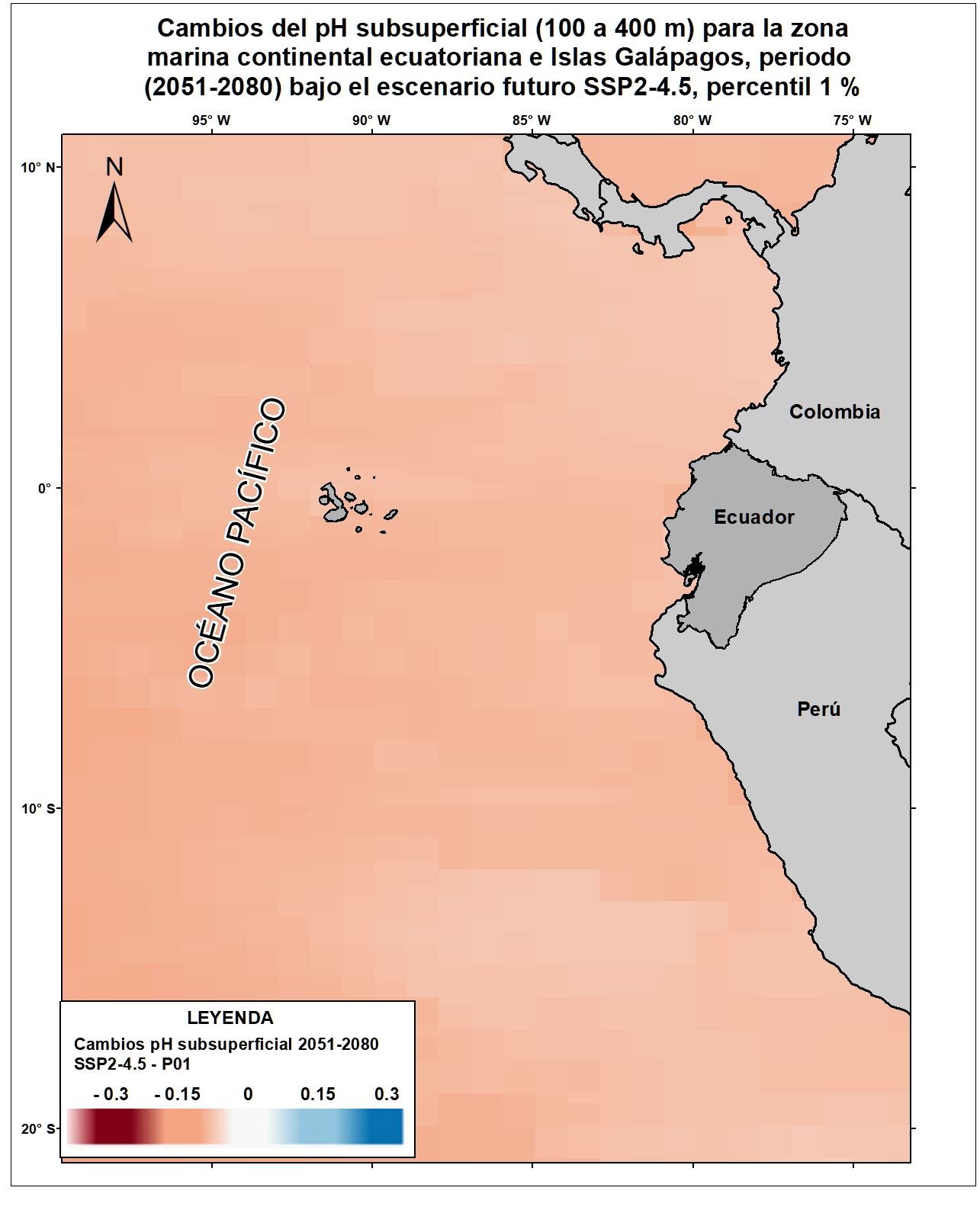 Las variables oceánicas como la temperatura superficial del mar, la acidificación oceánica, el aumento del nivel del mar, entre otras, resultan vitales para proyectar y monitorear los efectos del cambio climático sobre el comportamiento oceánico y atmosférico a escala local, regional y global. Para el país, la generación de información clave sobre esta temática permitiría evaluar la situación actual y posibles consecuencias futuras de las alteraciones climáticas sobre las zonas costeras y sus habitantes. Por esta razón, el Ecuador ha considerado estratégico incluir en la Cuarta Comunicación Nacional la generación de información sobre cambios en variables de mares y océanos ecuatorianos respecto al cambio climático. Bajo este enfoque se desarrolló el ensamble de 9 Modelos Climáticos Globales del CMIP6 para la variable pH subsuperficial (100 a 400 m) referidos para las costas del Ecuador y Galápagos. Esta capa corresponde a los cambios esperados para el pH subsuperficial (100 a 400 m) para el horizonte lejano (2051-2080) en el escenario SSP2-4.5 (percentil 1%). Para una adecuada visualización y representación de los datos en relación al área de estudio (10°N y 20°S), se recomienda fijar los valores mínimos y máximos de acuerdo a lo siguiente: Valor máximo: 0.3, Valor mínimo: -0.3